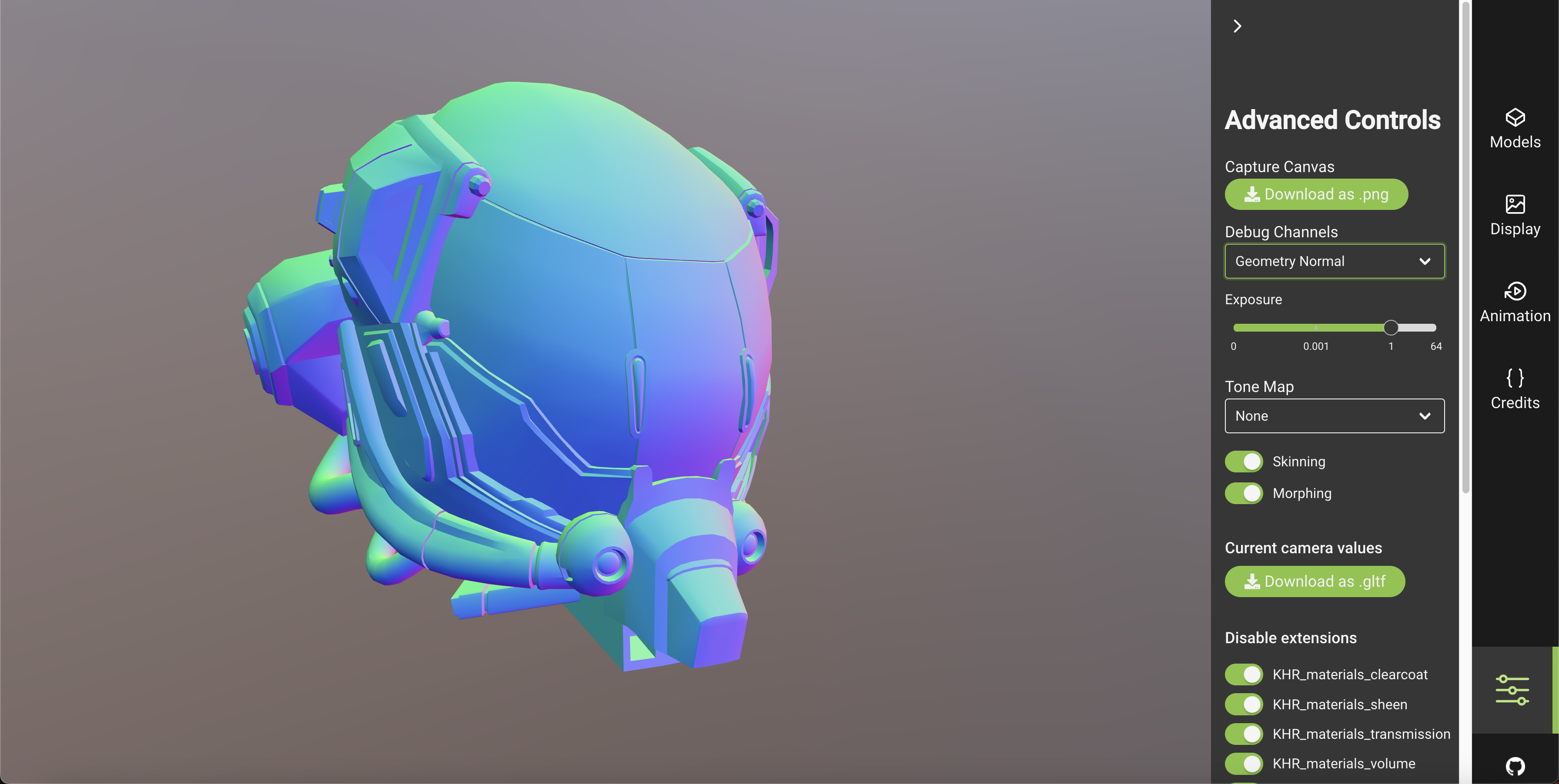 One great tool to analyze your glTFs is using glTF Sample Viewer . This tool allows you to inspect channels, textures, reaction to different light environments, preview animations and so much more! Ideal for single models.