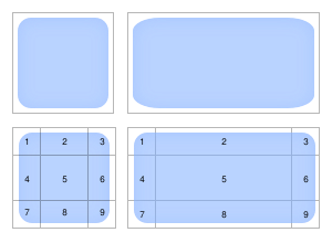 With this popular technique, you slice an image into 9 segments, that will be stretched in different ways to preserve the proportions of the margins and corners. For example, use this to define rounded-corner backgrounds that easily adapt to any size. Consider the following image (borrowed from Wikipedia ):