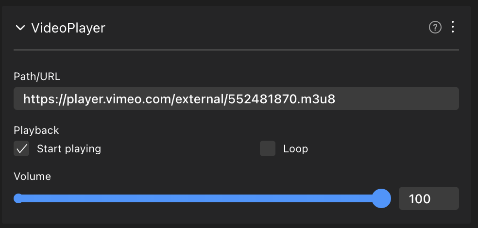 📔 Note: Avoid playing more than one video at any given time in your scene, because it can severely impact performance for players. Always stop other videos before playing a second video.