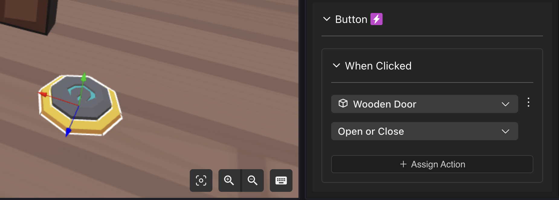 • Buttons: When clicked, they play sound and an animation as feedback. Add more actions to their trigger events to activate other smart items.