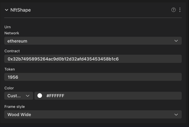 To display an NFT on a picture frame, use the NFT smart item. You must provide the following fields: