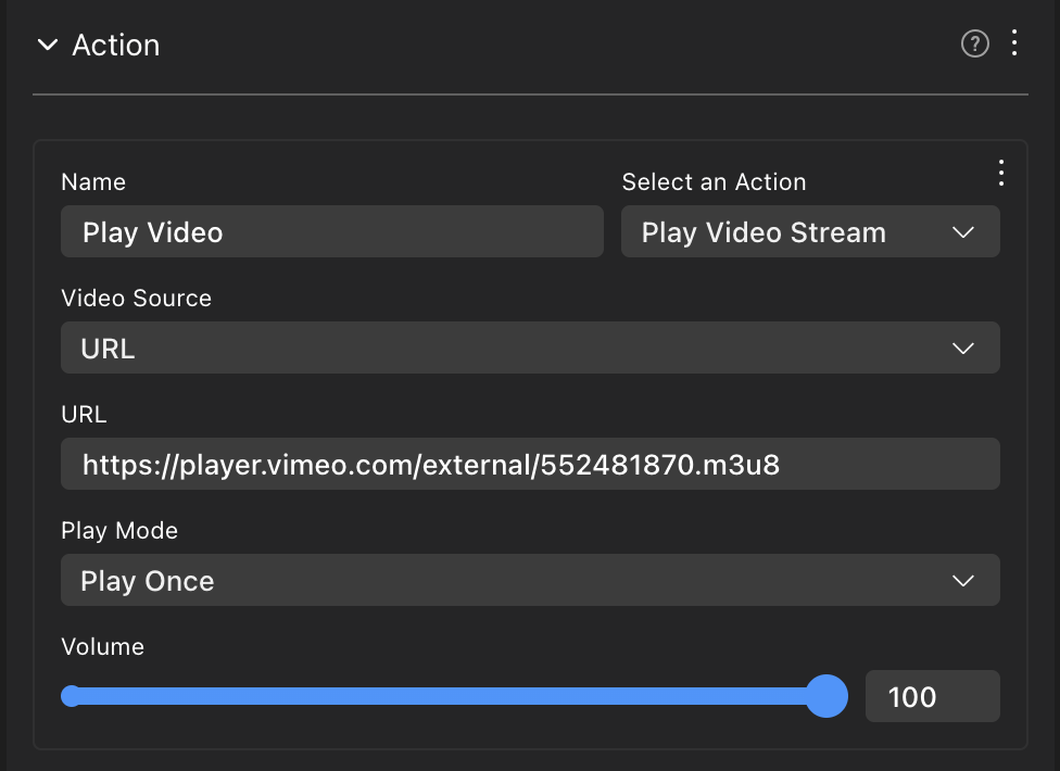 📔 Note: Avoid playing more than one video at any given time in your scene, because it can severely impact performance for players. Always stop other videos before playing a second video.