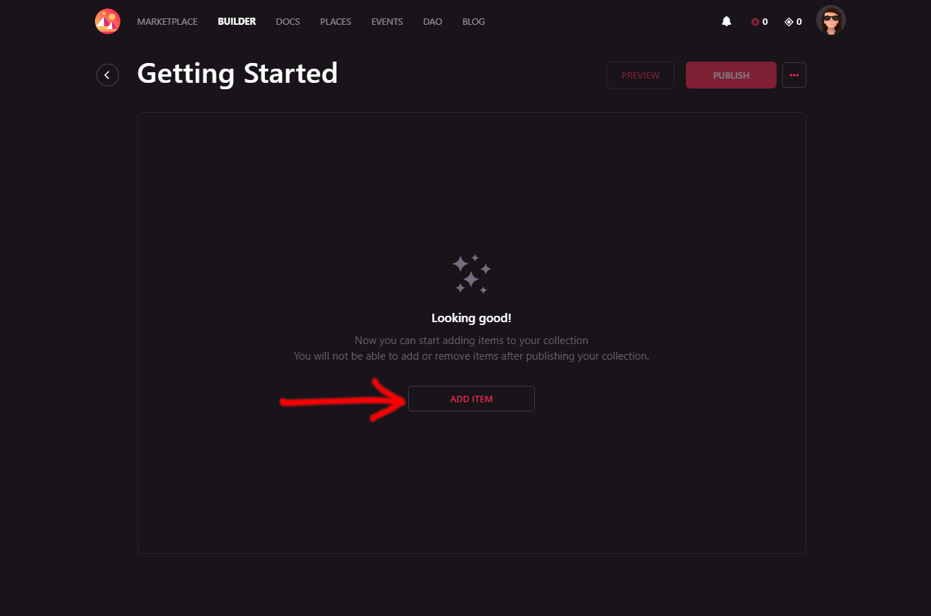 If you already have a collection and want to add more items to it, just click on Add Item and upload your file. You can add as many files as you want before publishing the collection.