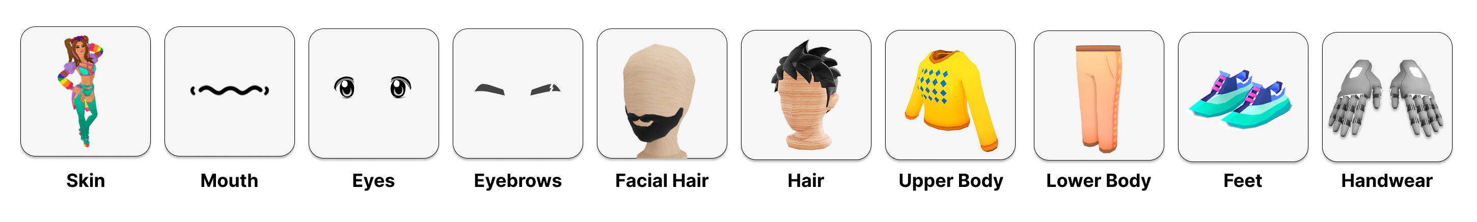 - Skin: Replaces the entire avatar (head, upper body, lower body and feet except accessories)