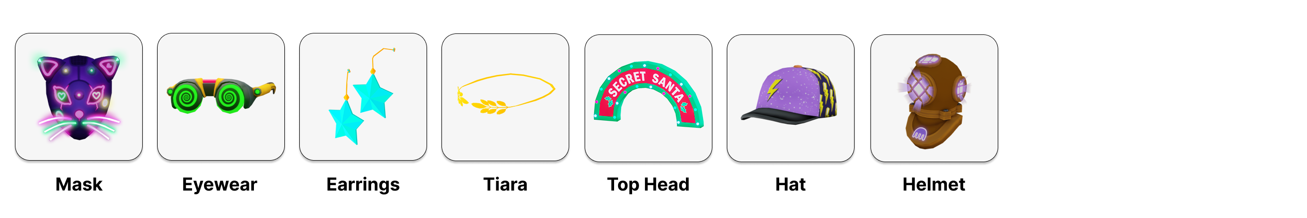 There are also accessories that can be applied to different areas of an avatar. Some of these accessories can impact other wearables. The accessories are: